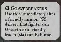 Speaking of delve synergies, Zondara’s Gravebreakers surely don’t mind having more places to dig up. The aptly named Gravebreakers ability triggers when “a friendly minion delves” so it’s perfectly fine to send Pikk over to a well of magic water and have him dig up Toyle. This gives the warband more places to be able to park the zombies to perform these useful delves, resulting either in raising slain fighters or drawing more cards.