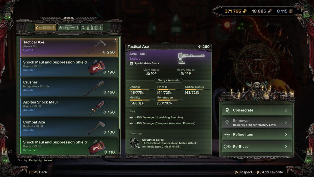 Gear progression has been overhauled and refined. Before you would spend time and resources constantly playing the Holy Slot Machine to roll a weapon with stats you like, and then re-roll again for blessings that were optimal to your build. There’s no need for that any more. (Thank the Emperor- err, Omnissiah.)