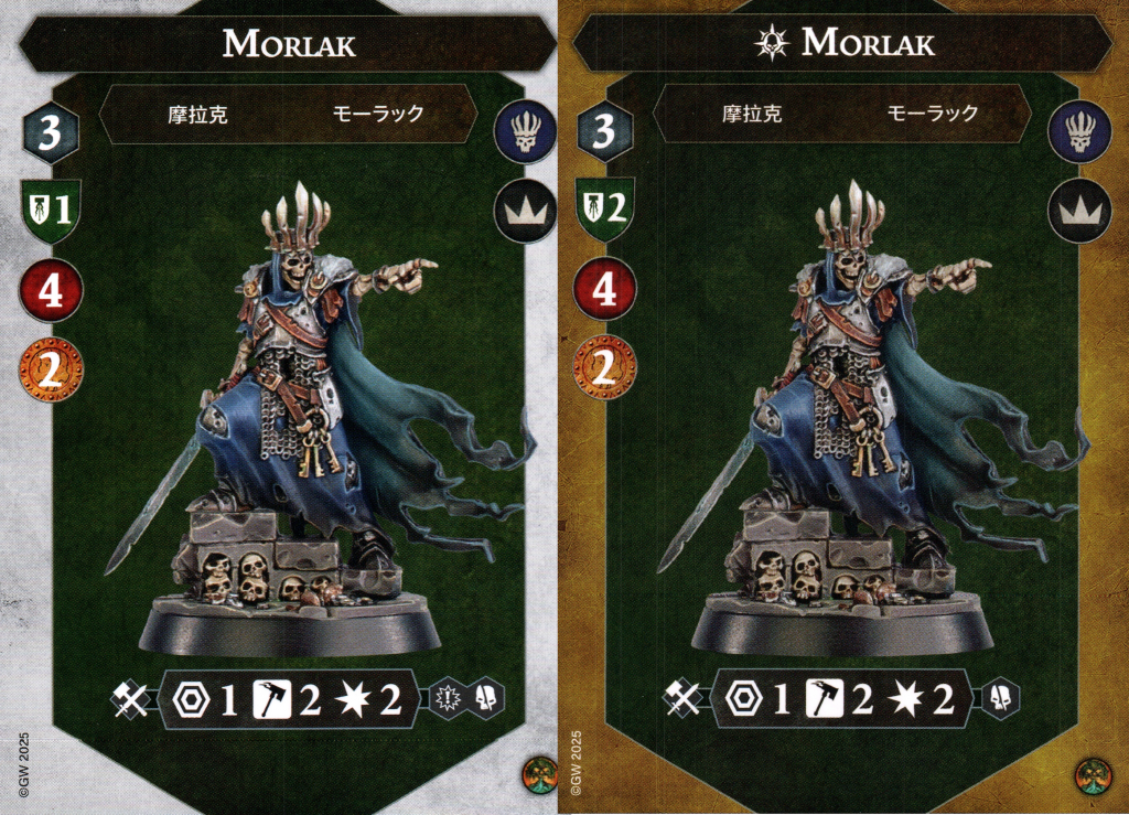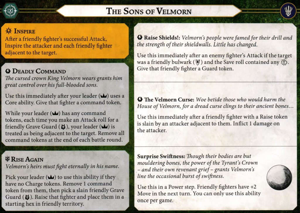 Velmorn Morlak is pretty key to this warband functioning, both through the ability to raise fallen Grave Guard and giving them enhanced accuracy by “flanking” the enemy. At 4 health and 1 shield, that’s not the most resilient profile so you’re going to have to be careful with him early on. He’s a juicy target and losing your leader early will set you back. Inspire ASAP and pick up that second save dice. He and the rest of the warband are about average at 3 move.