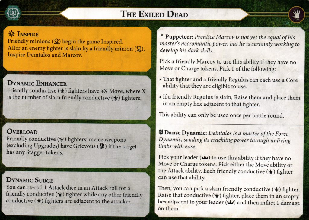 Danse Dynamic is the last but most important ability on this warscroll. We’re back to caring about Deintalos and his conductive fighters. The action economy that this ability grants is insane. You spend one activation to either move or attack with four fighters. If your opponent is attacking your conductive fighters to reduce the amount of actions you get from this, that’s fine – you also raise a slain conductive fighter after doing the action with all the surviving ones. Since the raise is after performing the action, if you choose to move then all of the surviving fighters will gain the movement boost from Dynamic Enhancer and then a slain fighter pops back up. The restriction here is that Deintalos can’t do this if he has move or charge tokens. Normally, charge tokens are what these extra core abilities care about but the fact that Deintalos can’t even have a move token is (hopefully) going to keep this from getting out of hand. The Exiled Dead player will need to have pushes or teleports to reposition Deintalos unless they’re willing to forego using Danse Dynamic for the remainder of the round.