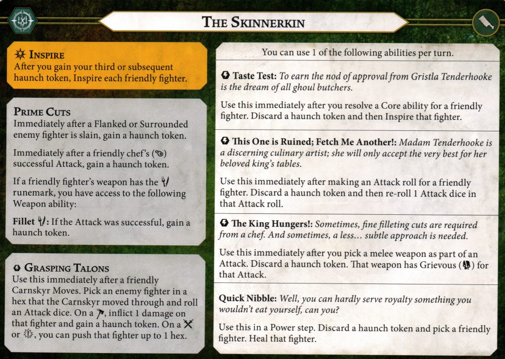 Taste Test is first on the menu. Getting to discard a haunch token to immediately inspire one of your fighters has some use, but the fact that it happens after you resolve a core ability means it’s a bit restricted. Inspiring does help a few of your fighters on their save dice, so if you’re in a tight spot and aren’t sure if you’ll be able to get haunches #2 or #3, you could use this for an immediate defensive boost on Carnskyr, Pewdrig, or Seddrik. Gristla and Kretch won’t benefit from it defensively, but they do generate haunches more reliably once inspired so you could use it to jump start your haunch train.
