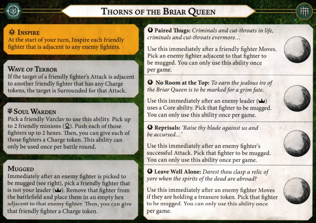 Interestingly, the Briar Queen herself doesn’t have any particular importance to how the warband functions. She’s not a valid target for Soul Warden and she is the only model that can’t benefit from teleporting via Mugged. None of the warband’s abilities turn off when she dies. She’s not even worth more bounty than any other fighter. This means you can be a little more aggressive with her and not care that much if she dies.