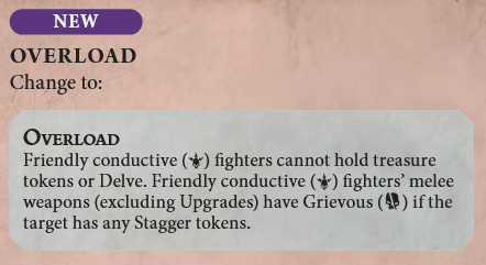 Coming in hot, the Exiled Dead aren’t even out and have already received a nerf. This warband had unparalleled action economy with Danse Dynamic – being able to move 4 fighters at once (and resurrect one that was slain afterwards) allowed some disgusting plays with feature tokens. Now those same conductive fighters can’t delve or hold treasure tokens, so they’re going to have to Danse elsewhere. Likely into combat which is still a frightening thought, especially when you consider they can take advantage of a double-plot pairing like Edge of the Knife and Deadly Synergy.