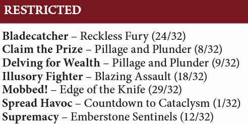 The only update to the Forsaken and Restricted list was the inclusion of Claim the Prize. Pillage and Plunder is now the only deck to have two restricted cards, both of which are pretty solid surges. I’m not crying over this because despite Pillage being an interesting deck, it’s also been played to death and I’m frankly sick of seeing it. Effectively, this is probably just banning Claim the Prize because Delving for Wealth is going to be the easier card to score most of the time. It also makes pairings of Pillage and Plunder with any other deck that has a restricted card a little more difficult which is fine by me.