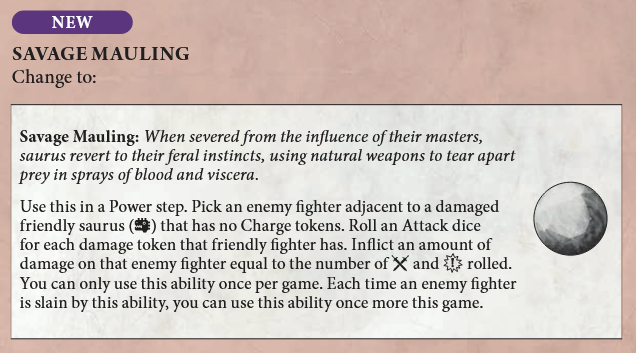 Pretty small change here and if you squint, you might miss it. The previous wording was dealing 1 damage X times where X is the number of successes rolled on the dice. This would be individual instances of damage that interacted weirdly with a few abilities, namely their inspire condition. Now it’s just a lump of damage dealt at one time. Technically it’s a small nerf to their inspire, but also allows this ability to actually kill a fighter equipped with Unstoppable from Wrack & Ruin.