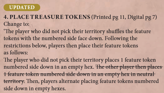 The first change not only reverts the token placement change from the Spring 2025 update, but it fully removes the requirement for a treasure token to be placed in neutral territory at all. All of the other old restrictions still apply – they can’t be in starting hexes, blocked hexes, stagger hexes, edge hexes, or within two hexes of another feature token. If it’s otherwise impossible to place one, they can be placed in an edge hex. And finally, there must be at least one treasure token in each player’s territory after the last one is placed.