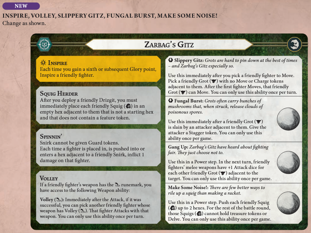 Finally, Make Some Noise! adds a familiar restriction to the squigs after it’s used. For the entire remainder of the battle round, neither squig can hold treasure tokens or delve after they’re pushed. The two squigs retain their ability to be deadly meat missiles worth 0 bounty, but they can’t be used for cheeky feature token antics. This feels reasonable because you still have seven whole other fighters who can double move that still can.