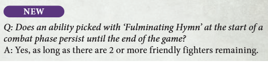 The previous rules update changed a rule saying that unless otherwise specified, abilities won’t end. This FAQ carries that same ruling forward to the Fulminating Hymn ability of the Brethren. Feel free to keep singing and singing, stacking up those buffs each round!