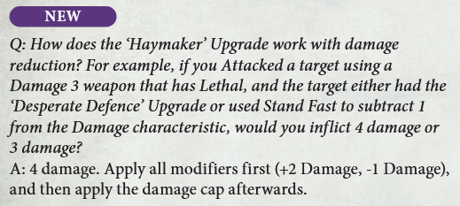 In an appropriate double whammy for this deck, Raging Slayers also has an FAQ for how Haymaker works. This upgrade has had a few questions crop up during gameplay due to its’ damage cap, and this question helps outline not only how this specific interaction works but (hopefully) answers most other questions about how the Lethal ability granted from Haymaker interacts with other modifiers.