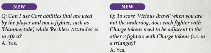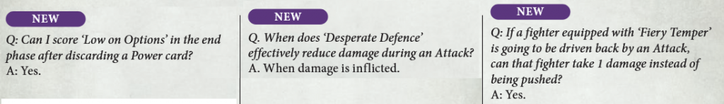 Good ol’ Reckless Fury. Nothing beats Reckless Fury. This deck has been reigned in to be less of a problem than it was during release, but it still has a few new questions pop up here. Reckless Attitudes constantly puzzles some players, so seeing more answers here is probably ultimately good for the community. I also appreciate the continued use of the “triangle” explanation for adjacent fighters.