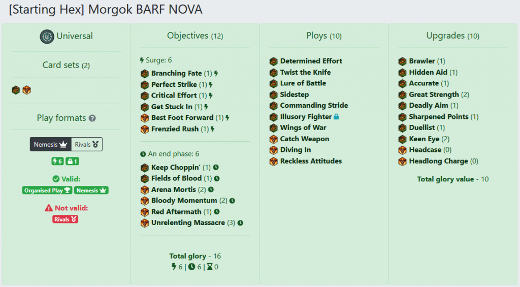 The power cards are similar. I can’t take multiple copies of Wings of War, but I can take a whole pile of cards that effectively do a similar thing. Between Wings of War, Sidestep, Commanding Stride, Illusory Fighter, Diving In, Lure of Battle, Headlong Charge, and even the Get A Move On, Ya Gitz! ability on my warscroll, I can very safely assume I will have access to at least one effect to give my fighters an increased charge range during the first round. The redundancy of having multiple copies of the same effect meant I could safely build my strategy around having access to these cards – or at least something that’s functionally similar to them. Similarly, there’s a whole package devoted to increasing the accuracy of my attacks – you know, those things I’m basing my entire game plan around – in the form of Determined Effort, Brawler, Hidden Aid, Accurate, Deadly Aim, Sharpened Points, and Keen Eye. They all do it slightly differently, so the raw redundancy isn’t quite as high as it is for the other sets, but the same idea was applied here.