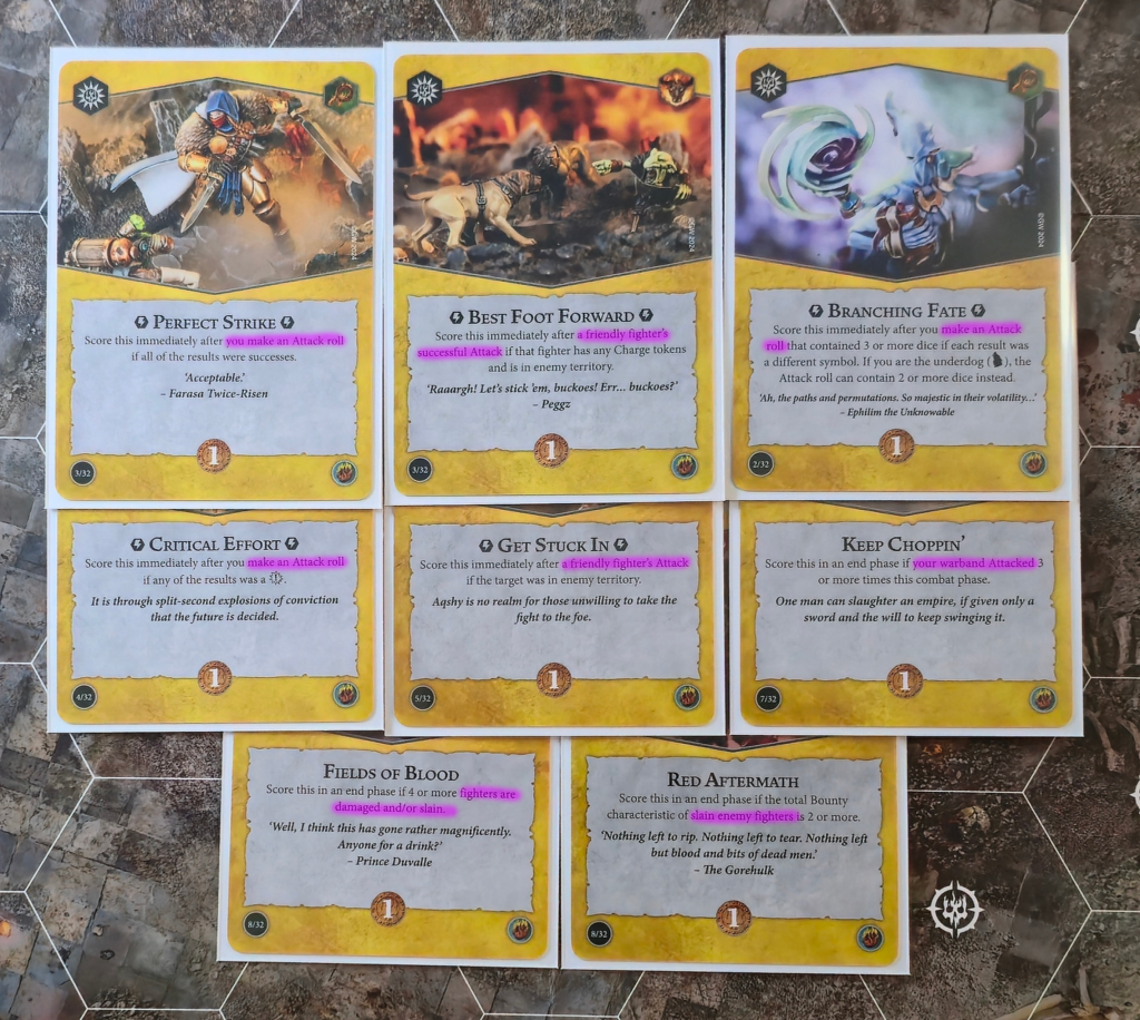 This isn’t a convoluted or terribly innovative deck. The Blazing Assault and Reckless Fury pairing has been a staple for aggro warbands since the release of the game at the World Championship of Warhammer last year. The game plan is a very simple and straightforward one in which I want my orcs to run forward and hit the opponent. The card choices I made are to enhance my chances at both running forward and hitting the enemy as much as possible while also having the objectives align with that plan. In a perfect world, every objective would be something like “make an attack” because that’s what I want to do in all 12 activations anyway, and all the power cards would just help me in making those attacks.