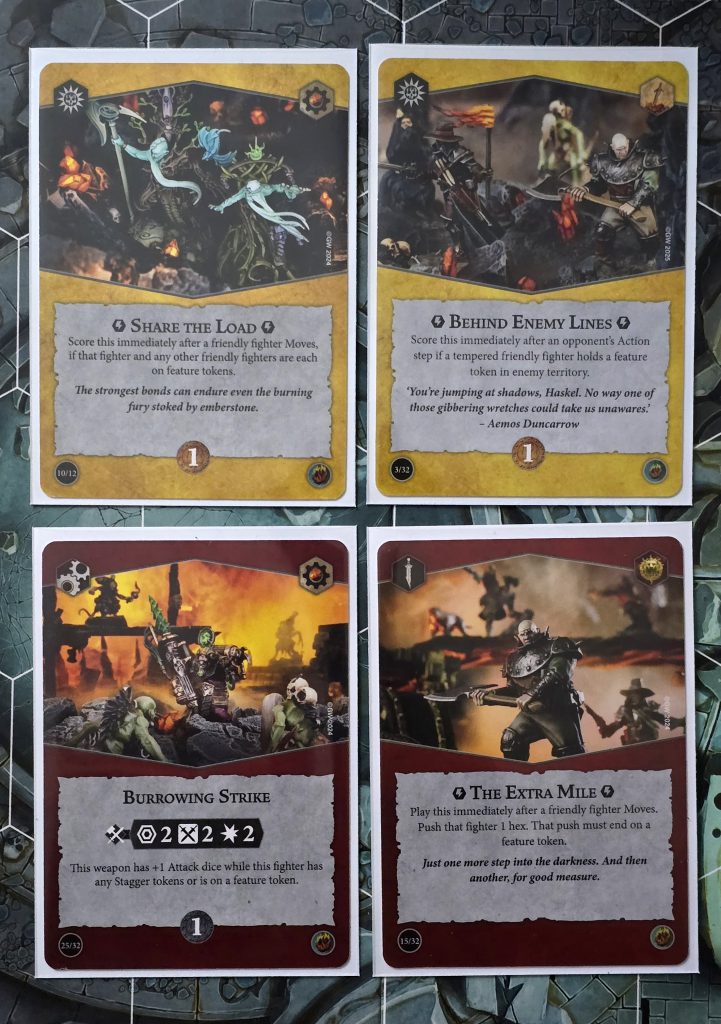 Re-rolls on both attack and defense are quite valuable – they’re available in upgrade forms that cost one or two glory, and baking in re-rolls on attack is basically the entire draw of the latest Raging Slayers deck (check out our review here if you missed it last weekend). A huge amount of scoring in this game hinges off of landing attacks, whether that’s scoring bounty for slaying enemy fighters or meeting criteria for making successful attacks on objective cards. Being able to reliably hold these hexes will considerably boost your fighters’ power and conversely, also make any of your opponent’s fighters far more problematic.