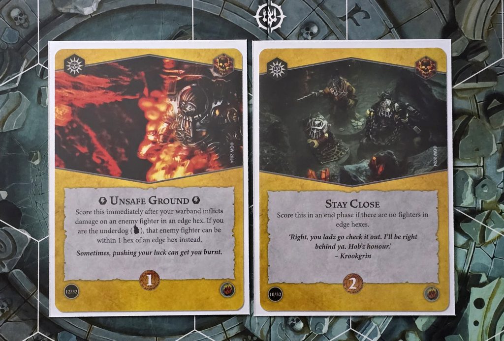 Looking at the Waystone Hexes on the green board, I noticed they are quite spread out. If fighters concentrate action on and around these hexes, they’re going to be further away from neutral territory as well as being closer to edge hexes. This could make scoring cards like Wrack & Ruin’s Unsafe Grounds easier while at the same time making it less of a conscious sacrifice to play around the same deck’s Stay Close.
