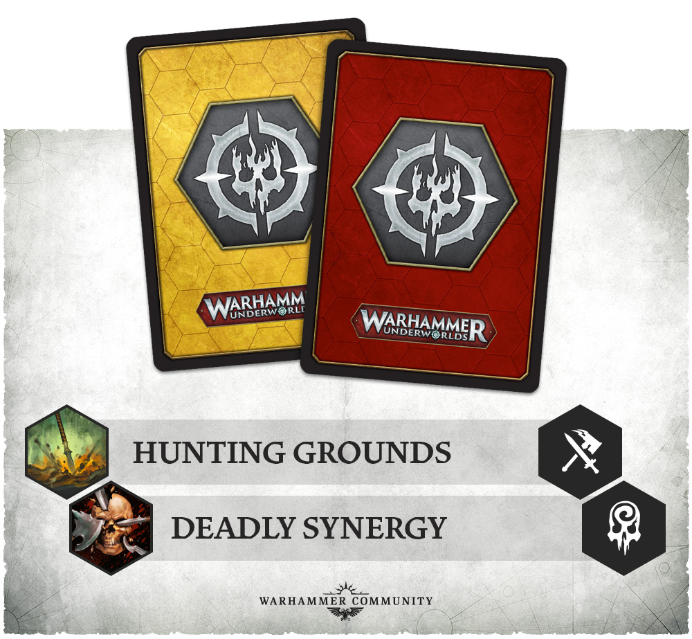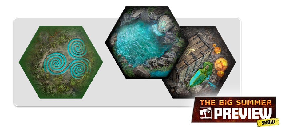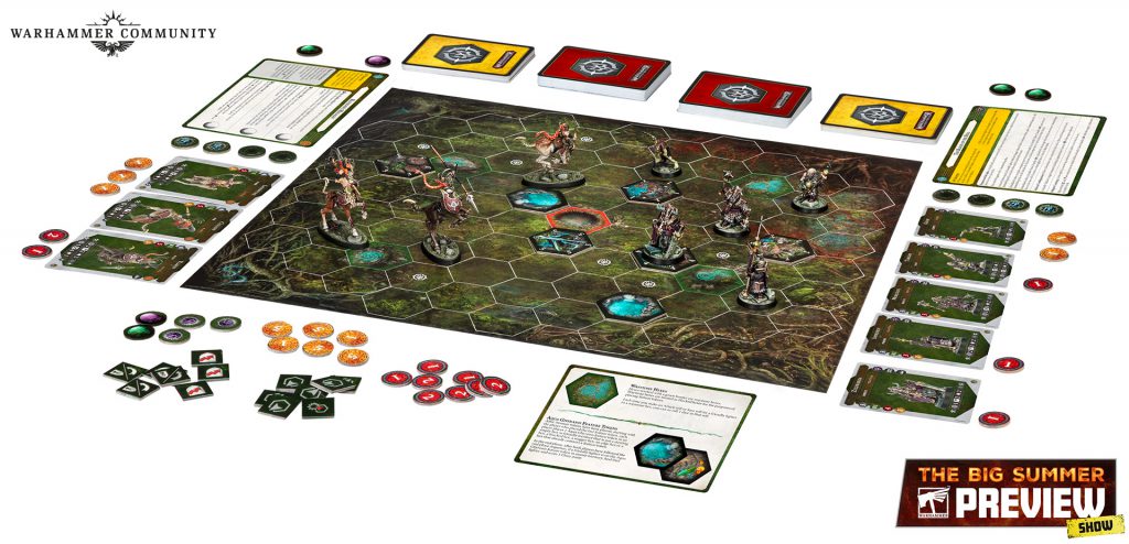 Here’s our first glimpse at the new board but also teasing images of the fighter cards, warscrolls, and what looks to be a reminder card for how the new hexes/tokens work in Spitewood.