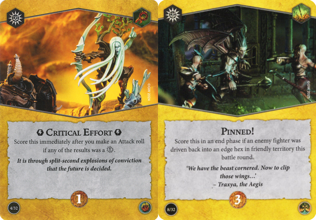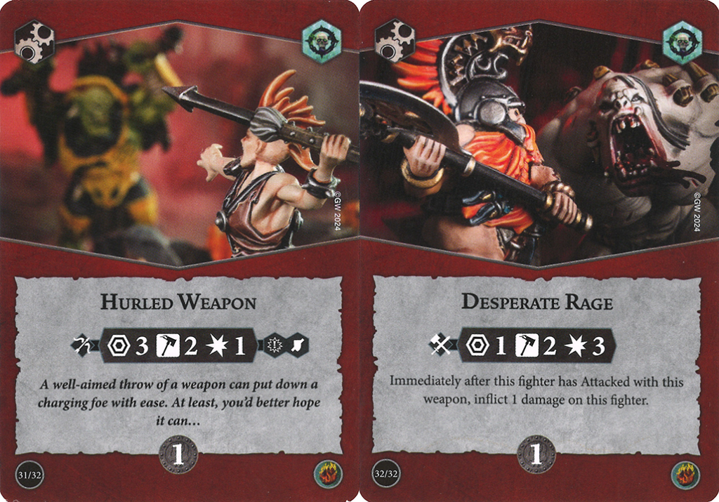 Score objectives: There are quite a objectives in this game that key off of attacks. Some, like Best Foot Forward, want you to make a successful attack so by tooling up a fighter with a more reliable attack you can stack the odds in your favor. Other objectives key off of specific dice results on the attack – you’re more likely to score Critical Effort with Angered Swing (potentially rolling 6 dice) than you are with any fighter’s native attack options. Sometimes just giving a fighter a longer range weapon like Hurled Weapon can allow them to even be able to make an attack in the first place and enable scoring potential you’d otherwise not have. Finally, in some cases for recent objectives like the surges in Hunting Grounds, you want to make attacks that drive the opponent back. You can’t drive back if you outright kill an enemy fighter, so equipping a lower damage but still accurate weapon can give fighters a non-lethal option to ensure objective scoring. I know I’d be willing to “downgrade” the attack of someone like the Wielder of the Blade if it means I can score 3+ glory from various objectives like Pinned!, Hands Off!, or Outmuscle.