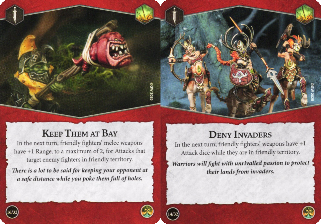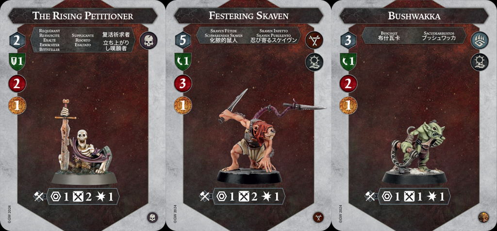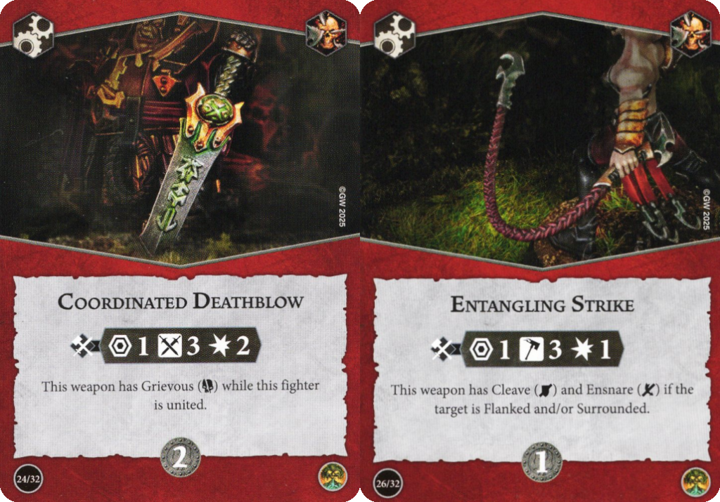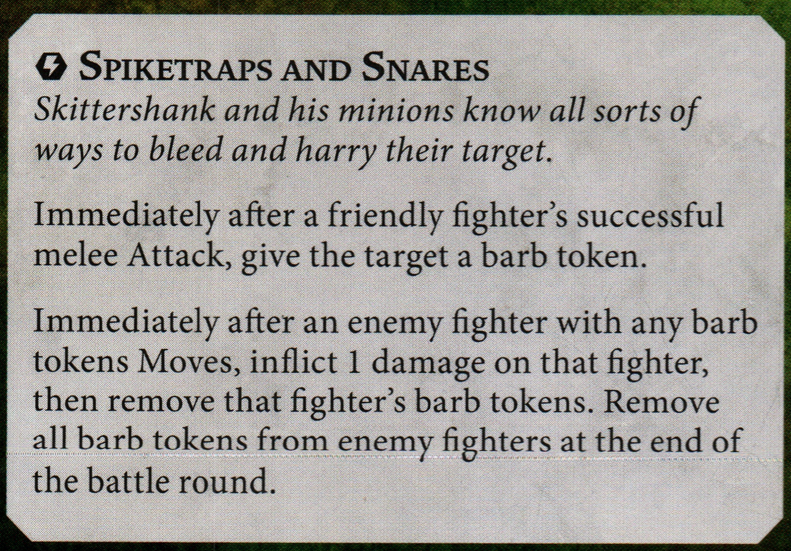 Leverage warscroll abilities: Many warscrolls offer unique benefits for their fighters making attacks, but some of them are also transferable to attacks made with weapon upgrades. The new Skittershank’s Clawpack for instance allows all friendly fighters’ melee attacks to apply barb tokens that damage the enemy if they move. This isn’t limited to their fighter card attacks, so you can take one of the two ranged-only fighters in this warband and equip them with an Entangling Strike or Hidden Traps to give them some highly accurate melee attacks to hand out barb tokens. Likewise, all the ways the Skinnerkin can spend haunch tokens to enhance their melee attacks can also work with weapon upgrades – add a re-roll to Coordinated Deathblow or Desperate Rage to get some reliable damage 3 attacks or tack grievous onto Angered Swing for a different route to the same reliable 3 damage. Carefully read your warband’s warscroll abilities to see if you can leverage weapons to help them out.
