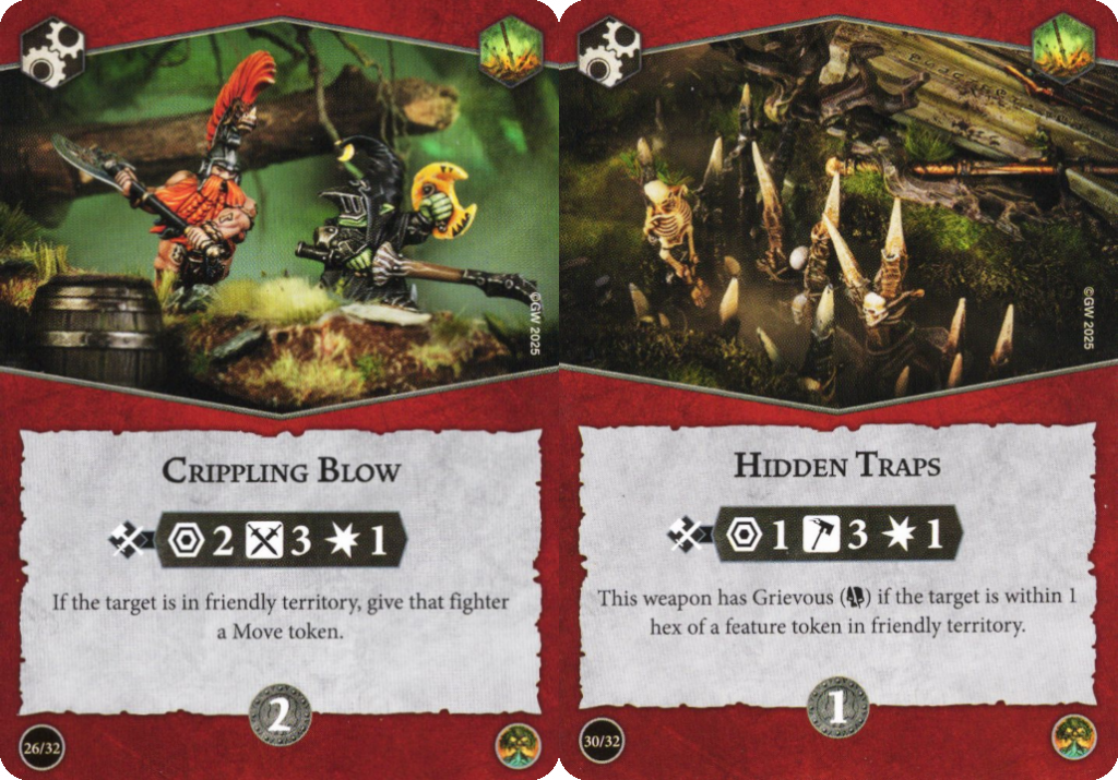 Two brand new weapons crop up in the first of the two new decks. Both of these have a little more going on than their earlier compatriots. Crippling Blow has an incredibly unique mechanic attached to it. Throwing out move tokens to enemy fighters regardless of whether the attack hits plays strongly into Hunting Grounds’ theme. Hidden Traps is a highly accurate attack – comparable to the empowered version of Emberstone Edge – and can even serve as a damage upgrade for many weaker fighters in the current feature token dense meta.
