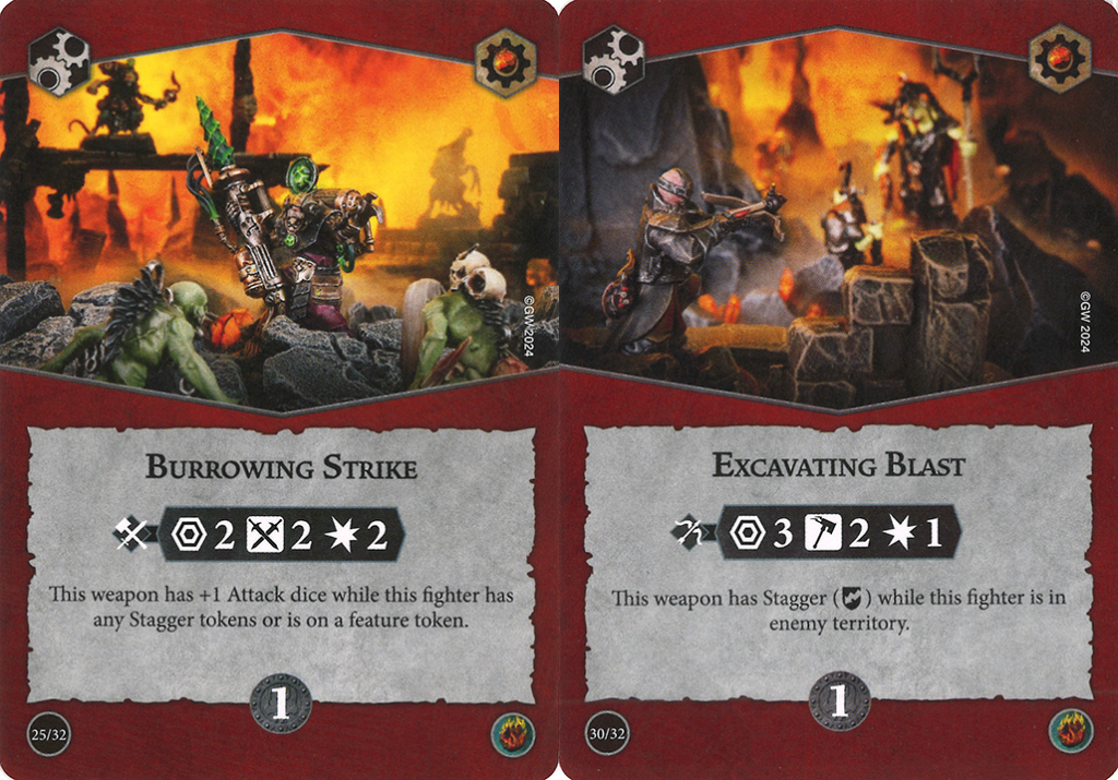 These two weapons have the benefit of both having some extra range on them as well as the potential of both being fairly accurate. They both have a fair bit of utility from that and Burrowing Strike even deals 2 damage which is a nice upgrade for many fighters who only have 1 damage attacks. Due to the gameplan of Pillage & Plunder, Burrowing Strike is often able to pick up that extra attack dice while Excavating Blast’s conditional stagger has rarely come up for me. I’ll be honest, I think I’ve simply forgotten about it in many games.