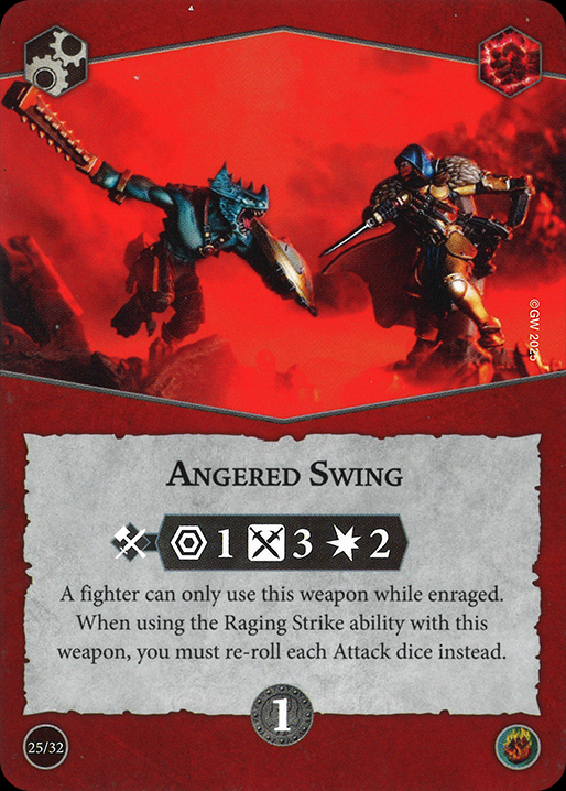 Angered Swing is another weapon that interacts in a special way with its deck’s plot card. By itself, it’s not too bad in terms of damage or accuracy but once you unlock the full attack dice re-roll through the Raging Slayer’s plot card ability, you can do some fun stuff with it.