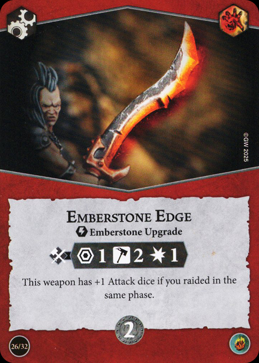 Emberstone Edge is a fairly niche weapon. One of the main things that makes it unique is that it’s an Emberstone Upgrade and thus interacts in a special manner with its deck’s plot card. I believe the design is intended so that you have access to a reliably accurate melee attack once you pick up the bonus attack dice which will enable future raid triggers. If you’re taking a warband with a few low accuracy fighters in the Realmstone Raiders deck, this could come in handy presuming you want to use it to score – damage wise, it’s nothing impressive and it’s also tied for the most expensive weapon upgrade at 2 glory.
