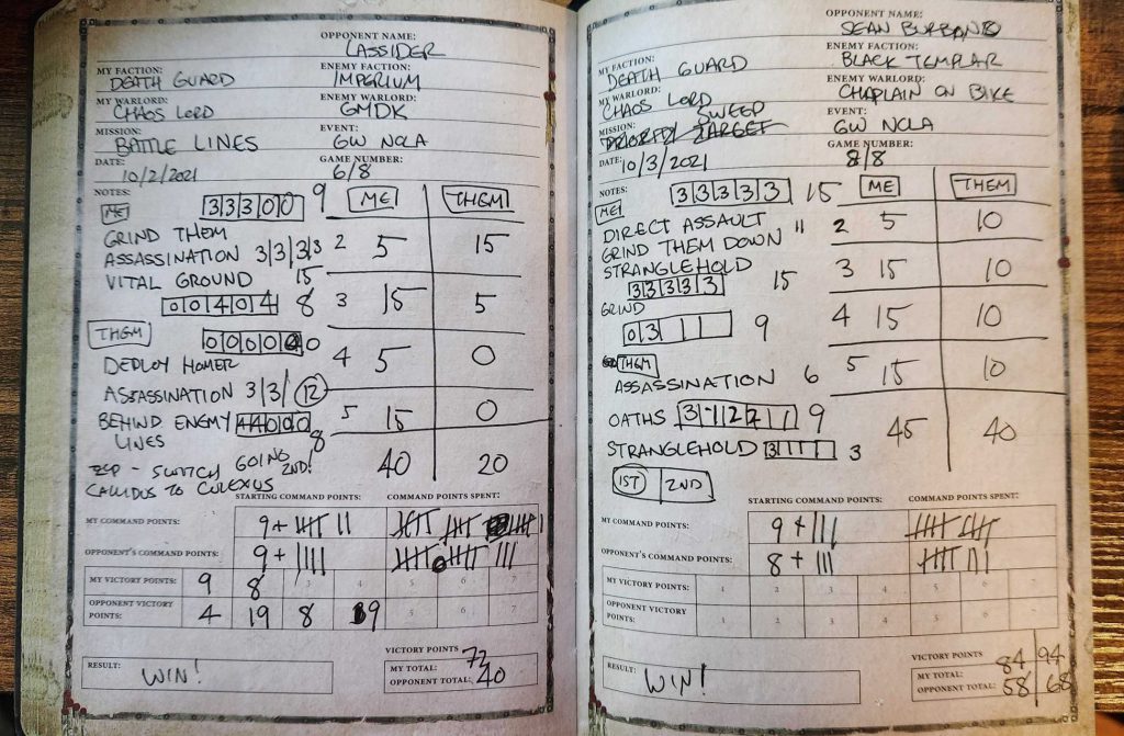 Take notes and photos. Writing good battle reports starts with taking good notes. Notes come in two forms: physical notes and photos. Back in the day I used to take notes of all of my games and jot them down in the Games Workshop battle notebooks. I filled two of those things and then transitioned to using the Tabletop Battles App in tenth edition. In addition to round-by-round scoring I’d jot down notes on who went first, plus any key plays or events – for that Grey Knights game I noted my opponent swapping out his Callidus Assassin for a Culexus before the game via Stratagem. These notes can be time-consuming to write, so what I generally try and do when I take them mid-game is use quick phrases or words that will jog my memory later.