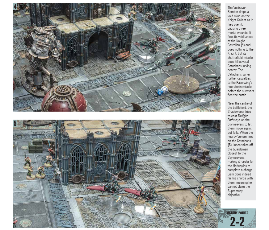 If you’ve got cool photos to add, put them in here. Again, we don’t need the play-by-play. Give us a shot of the table at the start for context, then show us some cool moments that you can put next to your descriptions. Full table shots are useful to show deployment and the flow of the game, but without detailed diagrams they’re hard to follow. Mix it up with some close-ups of key models and moments. - Give the outcome.